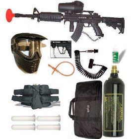 Tippmann A5 Marker, A5 Cyclone Ammo Hopper, 16" M4 Ported Sniper Paintball Barrel, Tippmann A5 Tactical Stock Adjustable, Fixed Sight Rail/Carry Handle, Tippmann Tactical M4 Mag Expansion Chamber, GXG Stealth Mask with Visor & Anti Fog Lens, 20oz CO2 Tank with Pin Valve, Heavy Duty Coiled Remote with Quick Disconnect On/Off, 21" GXG padded gun case, Tippmann Double Trigger, Deluxe 4+1 Harness, 4 - 140 Round Tubes, 4oz Premium Gold Cup Oil, Jerk Squeegee(color varies), Allen Wrenches, Standard Gun Oil, Tippmann Barrel Condom, Cleaning Cable, Operators Manual, Includes Stock Barrel, Full Two Year Warranty From Tippmann. * Bottom braided line connecting Magazine Expansion Chamber to ASA Tank Holder not included * The All New Tippmann A-5 is a high performance paintball marker with the patented Cyclone Feed System. The Cyclone Feed System Links the Feeder Sprocket to the Air System. The Faster you shoot, the faster the Tippmann A-5 feeds. Pull the Trigger 15 times a second, and the Tippmann A-5 feeds 15 balls per second. The Tippmann A-5 is also easy to clean and maintain with its no tool field strip feature. Innovative technology, maximum firepower, unsurpassed accuracy and Tippmann durability are the core foundations of the all new Tippmann A-5. Assembly is required.