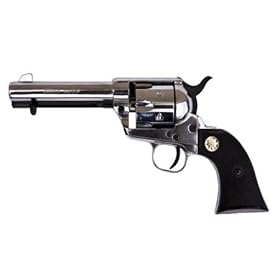 This authentic precision single action blank firing metal model has over 25 working parts and functions like the expensive original. Pull the hammer to half cock open the loading gate sin the cylinder load six 9mm (.380) blanks and your Old West stage prop revolver is ready for action. This piece is great for gun spinning or fast draw action shooting practice. It features a 4.75"" barrel assembled with black checkered composite grips and is available in either blued or deluxe nickel finish. You must be 18 years old to purchase this product and 21 to accept delivery. This product comes with basic eye and hearing protection. Please read the safety guidelines prior to use. Features Length: 10.5"" Weight: 2lbs Caliber: 9mm (.380) Blank Firing "