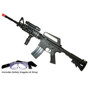 This airsoft rifle is great for the beginner. Very close in form and function to the real steel 16-A4, this inexpensive airsoft rifle will provide hours of enjoyment. This version features an extendable stock, LED illuminator and laser sight. With this M-16A4 replica, the admiration continues in the sports realm of AirSoft. Comes complete with safety goggles, rifle strap and 100 bbs.