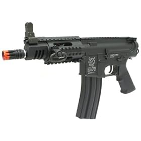 The PCR-97 M4 CQB is fully licensed, trademarked, and serial numbered using Olympic Arms markings. Covered by a TSD 30-day warranty, features of the PCR-97 include the following items: Unique serial number assigned Metal receiver Metal outer barrel FIRSCH style RIS Flip-up front sight QD sling mount Metal split gearbox Steel gears Silicon steel bushings Turbo 3000 motor  FPS: 300-330 w/ 0.20g Rate of fire: 920 rounds per minute Fire modes: Semi-auto, full-auto, safe Hop-up: adjustable Also included are two (2) 450 round high capacity magazines and a 1,000rd bottle of ICS BBs. Made by ICS. Does not include battery or charger.Olympic Arms PCR-97 M4 CQB AEG Pistol