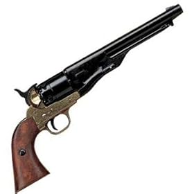 This piece is a full-size non-firing reproduction of the cap-and-ball pistol used by both Union and Confederate forces in the Civil War. The grips are made of real wood. The rest of the piece is made of metal. With this type of pistol, powder charges and bullets were loaded into each chamber on the barrel-side of the cylinder. (The loading lever on this replica is movable to simulate this process.) Explosive caps were placed on the hammer side of the cylinders. When the hammer struck a cap, the cap ignited the powder in the chamber, causing an explosion that propelled the bullet out of the barrel. This piece features a working action. When you cock the hammer, the cylinder turns. When the trigger is pulled, the hammer is released. Overall Length: 13.5 inches. This replica would be great for costume or nonfiring re-enactment use. It would also make a great film or theater prop. (The chances are good that you have already seen this item used in movies.) Or it could simply be a nice display or conversation piece.