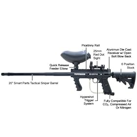 Package Includes: Tippmann 98 Custom ACT Platinum Marker CORE Collapsible M4 Stock for 98 Custom ACT Smart Parts Tactical Paintball Barrel Red Dot Sight CORE Gun Sling (Universal) Tippmann's new 98 Custom Platinum Series is now easier to upgrade, modify and maintain. New Features Include: Split Receiver Design , which provides easier access to internal components for simplified installation of grip upgrades and modifications Secure Front Sight Spring and Trigger Pins , which makes the marker easier to service and reassemble Easy-to-Remove Power Tube Design with self-sealing/locking gas line secures the valve in place and eliminates two bolts from previous design making maintaining the marker quicker and easier Full Depth Pockets for ASA , which eliminates the need to loosen the ASA bolts when disassembling the marker New Barrel Porting and a Matte Finish , which improves marker air efficiency and reduces reflective glare Picatinny Rails , which makes adding a carry handle, scopes and other accessories a snap Redesigned, Vertical Front Grip , which offers improved stability and added texture for a more secure feel Redesigned Sling Mount End Cap , which allows players to easily attach a variety of different sling styles There is also a new Quick Thread Flatline Barrel, which attaches as easily as any other barrel to save players significant time and effort.