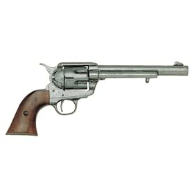 The Single-Action Army Revolver was produced in several forms and many calibers from 1872 to 1940, with production totalling about 350,000 pieces. As its introduction coincided with the settlement of the Wild West, the names Peacemaker and Frontier Six-Shooter were popularized. Used by legends like Buffalo Bill Cody, Wild Bill Hickock, Pat Garret and Bat Masterson it was also the weapon of choice for settlers in the West during the late 19th century. The Cavalry Models relatively long barrel provided excellent accuracy in capable hands. This non-firing version has a functional lock mechanism, with a revolving cylinder and working ejector system.