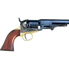 This accurate reproduction sports a 4" charcoal blued barrel and a detailed stagecoach roll on the cylinder. Walnut grips and a brass grip strap. Overall length: 9". Weight: 1 lb. 8 oz.