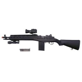 A heavy-duty gun with excellent performance at a low price. Includes a tactical rail system on the top and front sides for accessories. Fires at an amazing 360-380 FPS with .12g BBs and 280-300 FPS with .20g BBs. We recommend using .20g BBs for best accuracy. This is a spring gun and has to be cocked for each shot. It's fast, clean, inexpensive and easily maintained. Requires no gas or batteries.... Features: - 37-round magazine - Removable tactical rail system - Functional safety unit - Adjustable Hop Up - Adjustable rear sight... M116 spring rifle with tactical aim sight & flash light (Short Version of TSD Sports M14 Spring Sniper Rifle) 50-yd effective range Spring-powered Must be cocked for each shot Length: 36 inches Weight: 6.8bs...