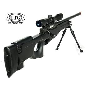 The UTG Type 96 Sniper Rifle combines firepower and comfort and delivers unbelievable performance. The thumbhole stock provides comfort and stability. The bolt action rifle shoots exceptionally. For sniper fans, the Type 96 Sniper Rifle delivers equally breath-taking performance (in the airsoft realm) at OVER 450 fps muzzle velocity - allowing you to snipe targets at twice the regular distance of unmodified AEGs. The stock of the L96 holds a high capacity (23 rounds) magazine. Using the APS2 bolt system and barrel as the main platform, this Type 96 sniper rifle also sports high end performance parts for greater accuracy and power. - One Piece Precision Metal Barrel - Adjustable Hop-up System - High Power Pin-Point Accuracy Performance - Effective Long Range Shooting - Complete Picatinny Mounting Rail Systems - UTG Deluxe Picatinny Mount Foldable Bipod Complete With Cleverly Designed Tri-Rail Bipod Adaptor - Ultimate Bolt Action Airsoft Spring Rifle - Spare Magazine - Spring Powered Deluxe Speed Loader - Tactical Sniper Rifle Sling... Velocity: 450-480 fps with .20g BBs410-420 fps with 0.28g BBs310-320 fps with 0.43g BBs The majority of this gun is metal. Only the stock is ABS, the rest of the gun (barrel, trigger, receiver, scope, scope mounts, bolt and bolt handle) are metal. Package: Included with the UTG Type 96 are two 23 rd magazines, tri rail quick release bi-pod adapter, UTG weaver rail bi-pod, UTG speed loader and a sling. Shown with but not included: 4X40 Full Size TS Platform Mil-Dot Scope and Full Size Weaver Scope Mount. Attention.The screws for the installation of the action and barrel are contained inside the stock, flip the stock over so you are looking at the under side you will see two holes one in the trigger guard and one just behind the magazine, the screws are located within these hole.Use the large Allen wrench (provided with gun) to attach stock to action/barrel unit.... Hop Up: AdjustableEffective range: 200-23...
