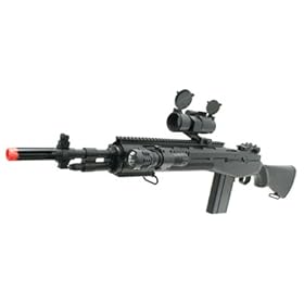Design is based on the workhorse M1 rifle. A heavy-duty gun with excellent performance at a low price. Includes a tactical rail system on the top and front sides for accessories. Fires at an amazing 350 FPS with .12g BBs and 300 FPS with .20g BBs. We recommend using only .20g BBs for best accuracy and performance. This is a spring gun and has to be cocked for each shot. It's fast, clean, inexpensive and easily maintained.... 37-round magazine Removable tactical rail system Functional safety unit Adjustable Hop Up Adjustable rear sight Attention customers! The batteries for the aim sight and flashlight come separately to ensure longer battery life. You must install the batteries yourself. Screwdriver not included.... TSD Sports M14 Spring Sniper Rifle Includes aim sight and flashlight! Come with orange tips to comply with federal law 50-yd effective range 37-round repeater Length: 40 inches Weight: 6.8bs...