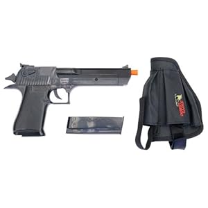 As a veteran spring airsofter, i will honestly tell you that this is a great sidearm. The holster is a great component to this airsoft kit. It is a universal holster meaning that it will hold not only the desert eagle , but various .45s, m9s,revolvers, you name it , it holds it. It also snuggly houses 2 magazines. The holster has the desert eagle emblem stitched into it.It is for right handed shooters.